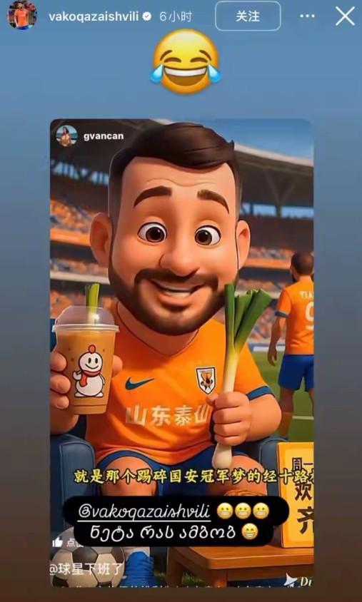 日前,山东泰山队外援瓦科(卡扎伊什维利)的妻子在社交媒体转发了中国网友AI生成的搞笑视频,视频中Q版瓦科手拿大葱和奶茶讲述自己踢碎国安冠军梦。见到这段视频后,瓦科本人回复了“”的表情。