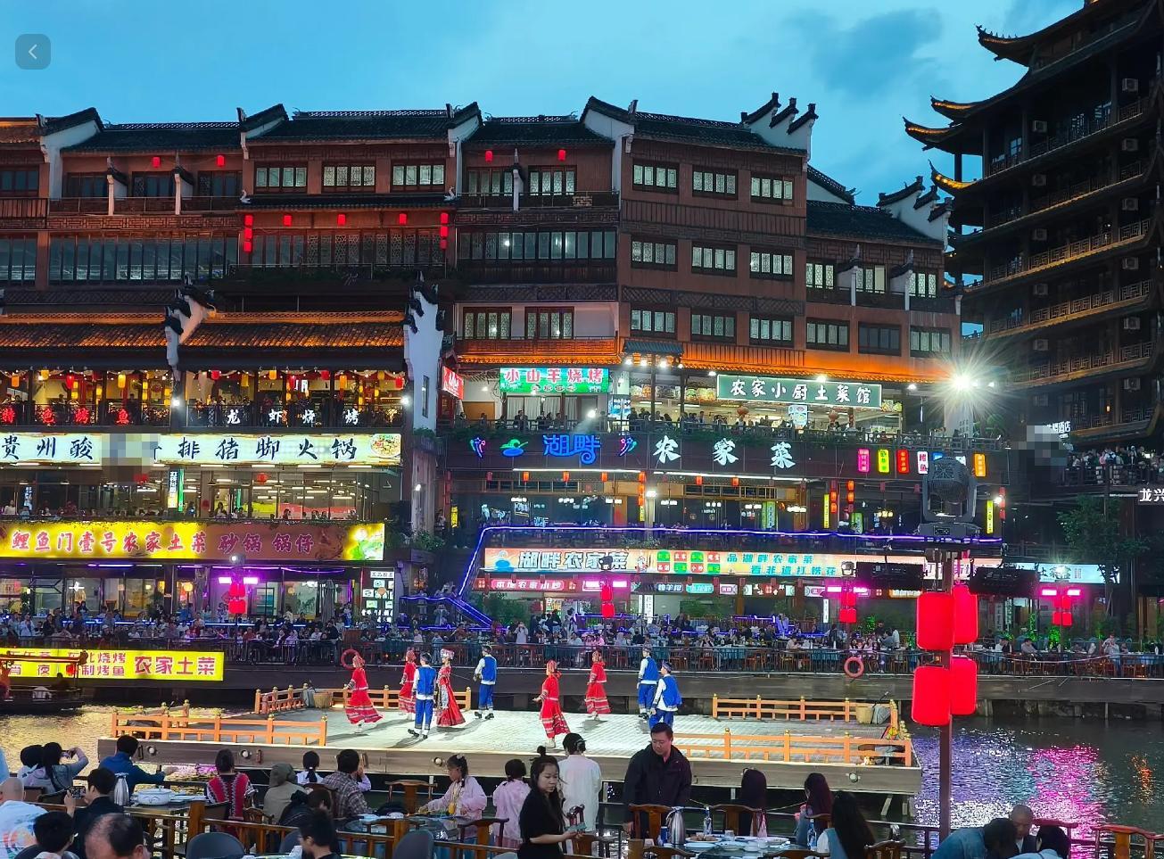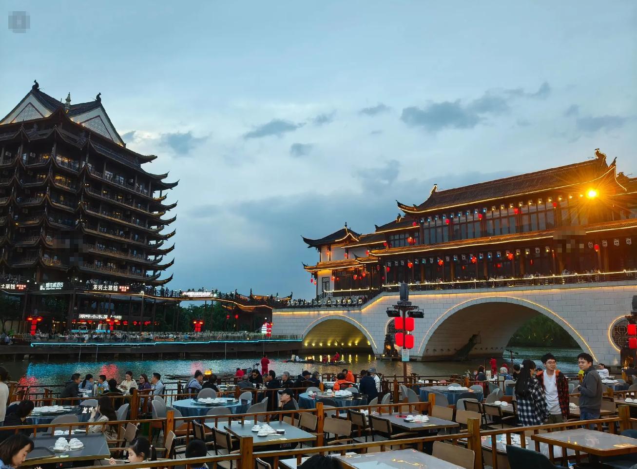 桥下一排都是餐厅饭店,很多游客都在吃宵夜,这些位置一边吃一边看演出,博主就带着孩子们去了。