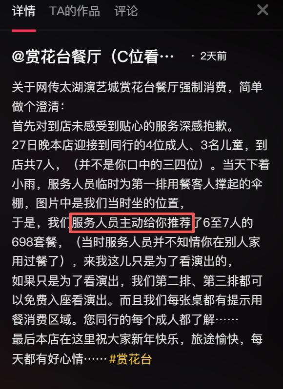 “这个座位必须消费698元才能坐”!那引导客人落座前为啥不说清楚?这一幕发生在2月27日晚上湖州某家餐厅内,博主带孩子和朋友来古镇玩,这家餐厅位置非常适合看演出,他们就坐下打算点几个菜边吃边等。凳子还没暖热呢,就有个服务员引导他们坐另一个位置,等他们点完菜准备付款时,才表示坐这个位置有低消...